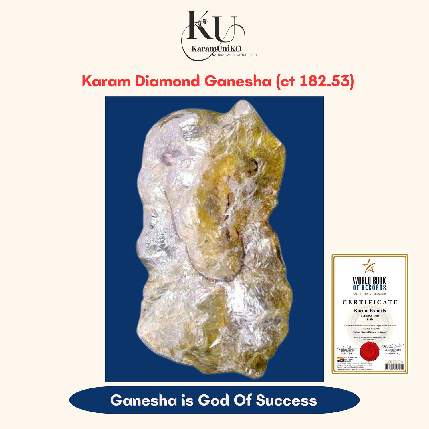 World Book of Records RecognitionIn recognition of its unmatched rarity and natural divine resemblance, the Karam Diamond Ganesha was officially honored by the World Book of Records, London, UK, and awarded the title of:“Unique Diamond Stone of the World”The Certificate of Excellence was felicitated at the British Parliament, London, marking a historic moment of global acknowledgment for this sacred natural diamond. This honor celebrates not only the stone’s uniqueness but also its cultural, spiritual, and social significance.