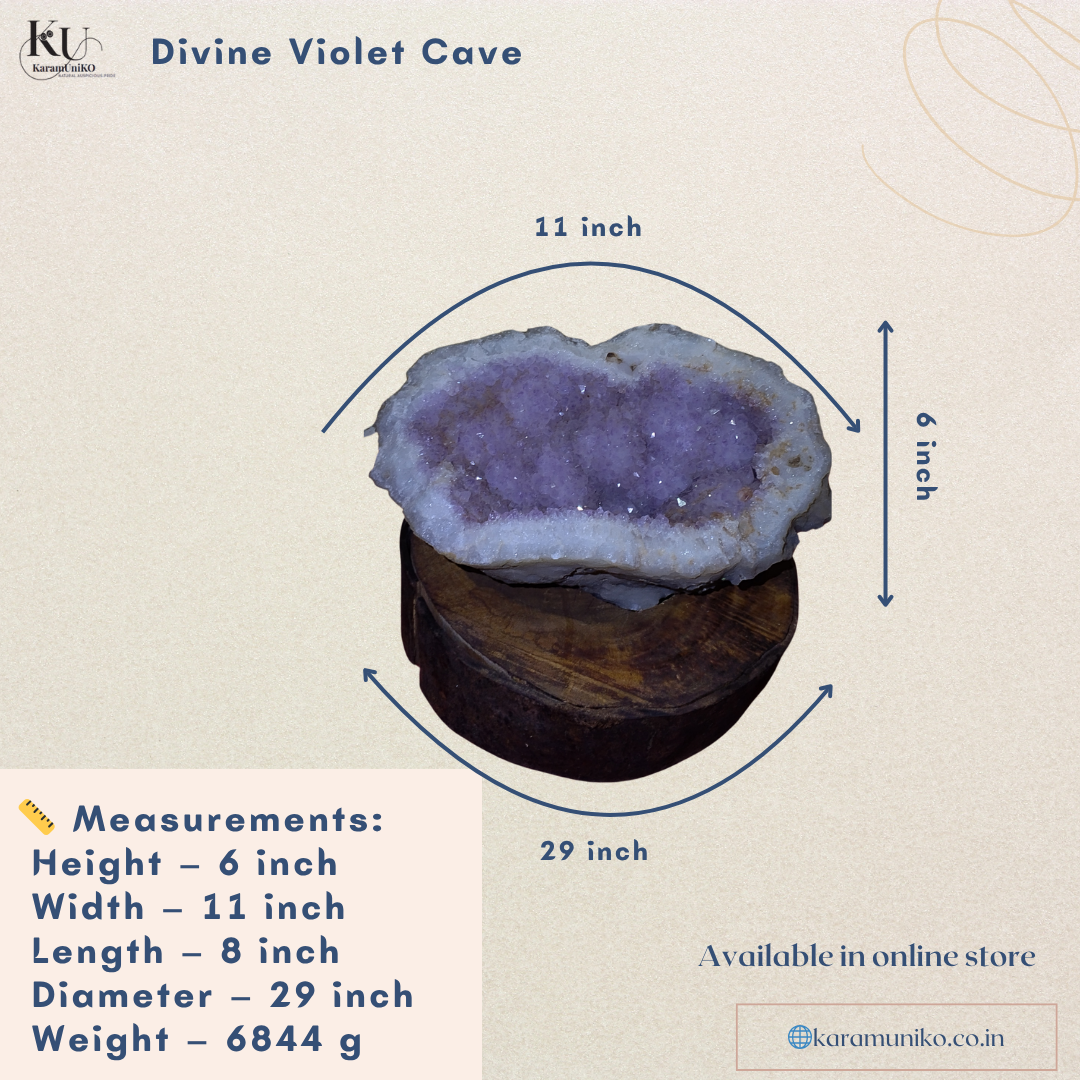 Discover the ethereal charm of the Divine Violet Cave, a magnificent creation of nature that embodies peace, healing, and spiritual connection. Carved by the Earth and crowned with radiant violet crystals, this Amethyst geode formation invites divine calmness and inner balance into your surroundings.