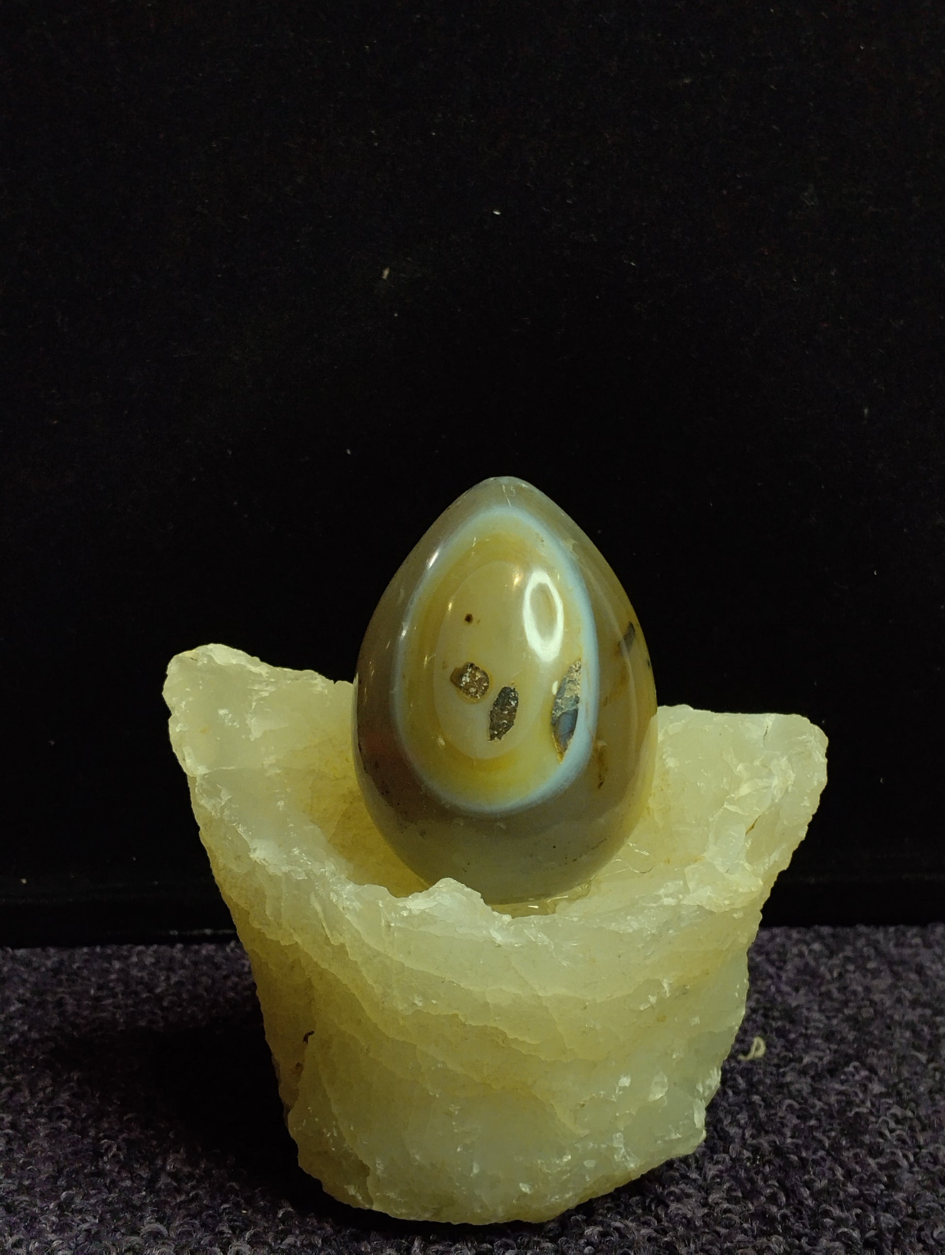 This exquisite piece pairs nature's intricate artistry with meditative grace. The polished teardrop-shaped gemstone, flowing in earthy hues of mocha, taupe, and smoky grey, is flecked with shimmering inclusions that catch light like glimmers of stardust. Its smooth, high-gloss surface invites reflection—both literal and spiritual. Nestled atop a rugged, translucent yellow mineral base, the composition balances texture with refinement, raw beauty with poised serenity.