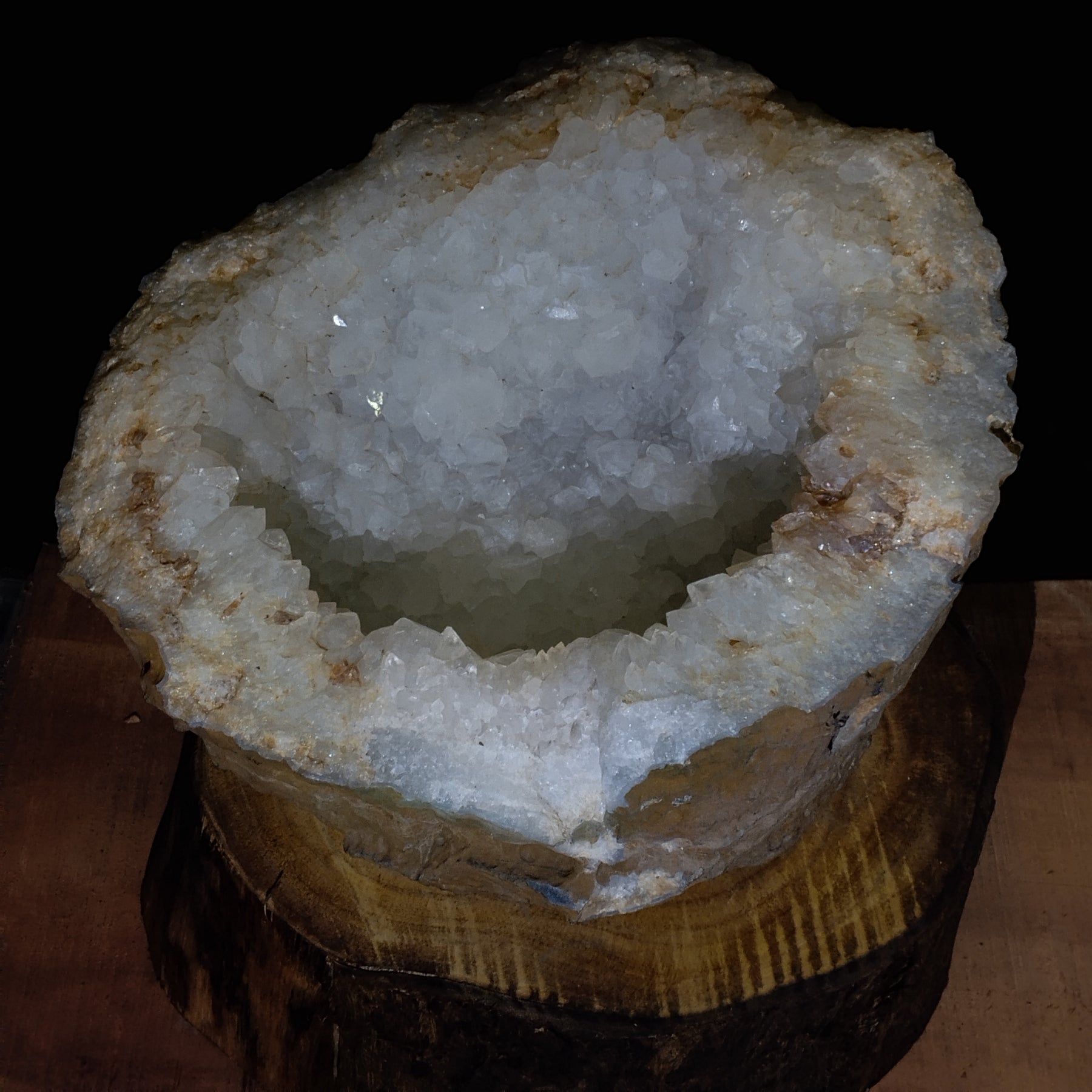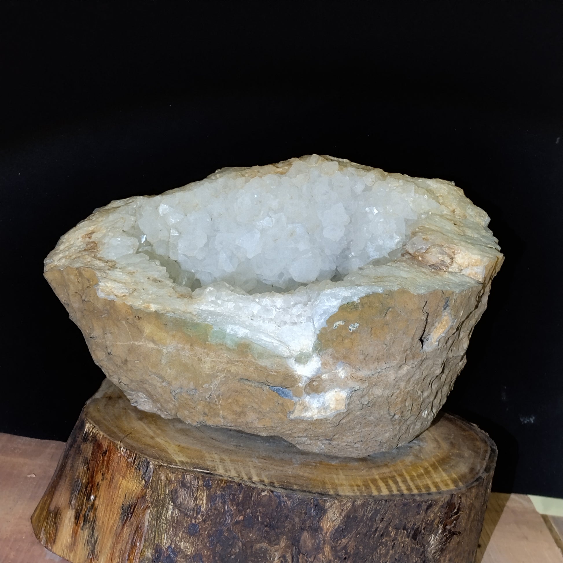 Unveil the quiet majesty of nature with this captivating geode—its rugged, earthen shell opening to reveal a crystalline sanctuary within. Nestled on a cross-section of natural wood, this piece bridges the raw power of the Earth with the refined beauty of its hidden treasures.