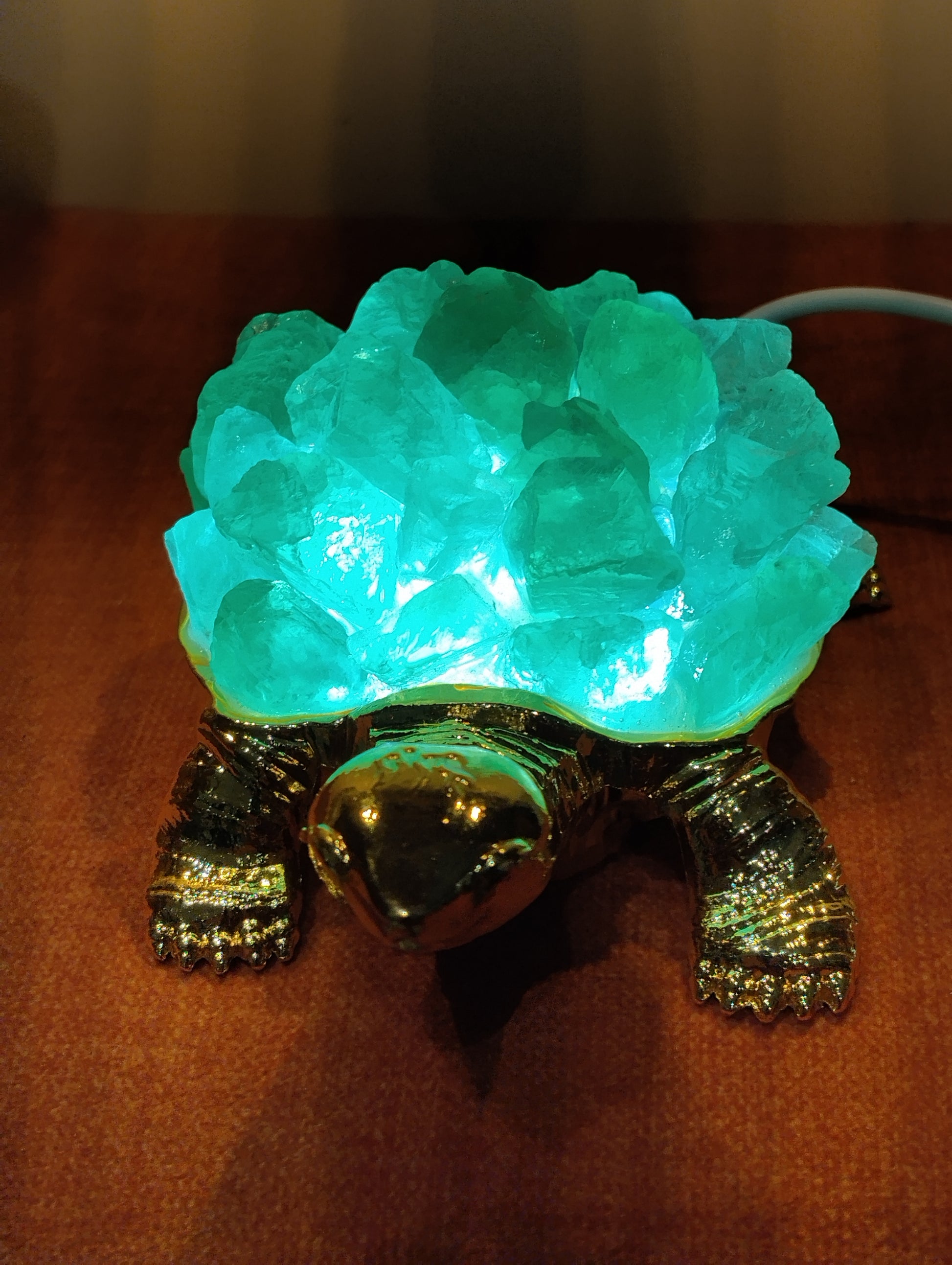 Description: Elevate your space with the serene charm of the Verdant Glow Tortoise, a radiant lamp that blends ancient symbolism with contemporary artistry. Crafted with a gleaming gold-toned metal body and crowned with a shell of luminous green crystals, this turtle-shaped sculpture emits a soothing glow perfect for meditation, relaxation, or spiritual ambiance.